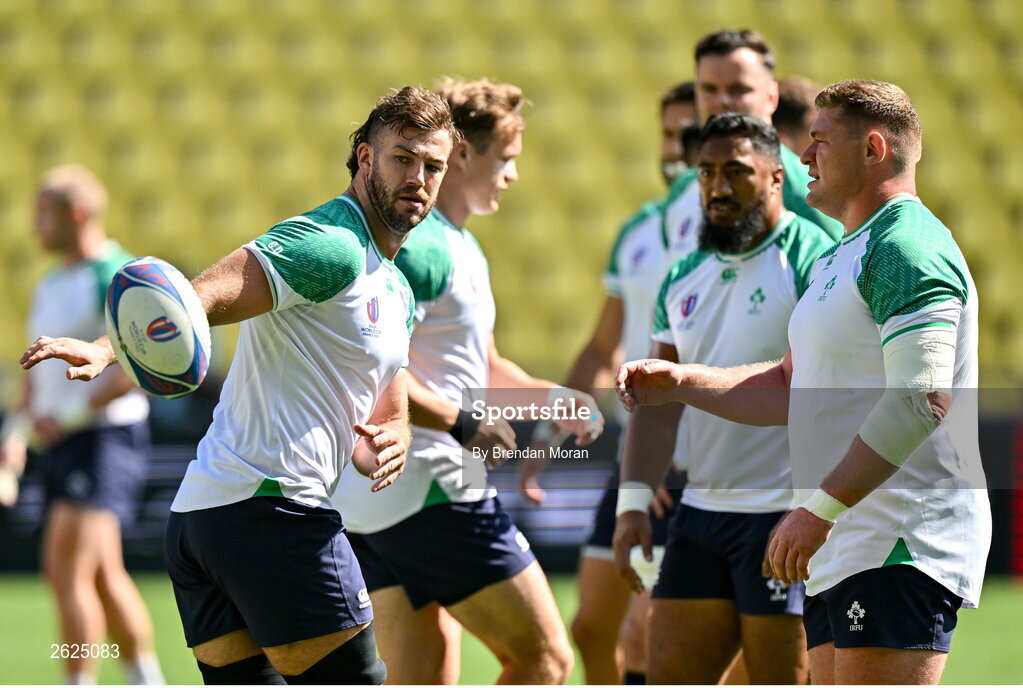 15 September 2023; Caelan Doris, left, during the Ireland rugby squad captain's run at the Stade de la Beaujoire in Nantes, France. Photo by Brendan Moran/Sportsfile