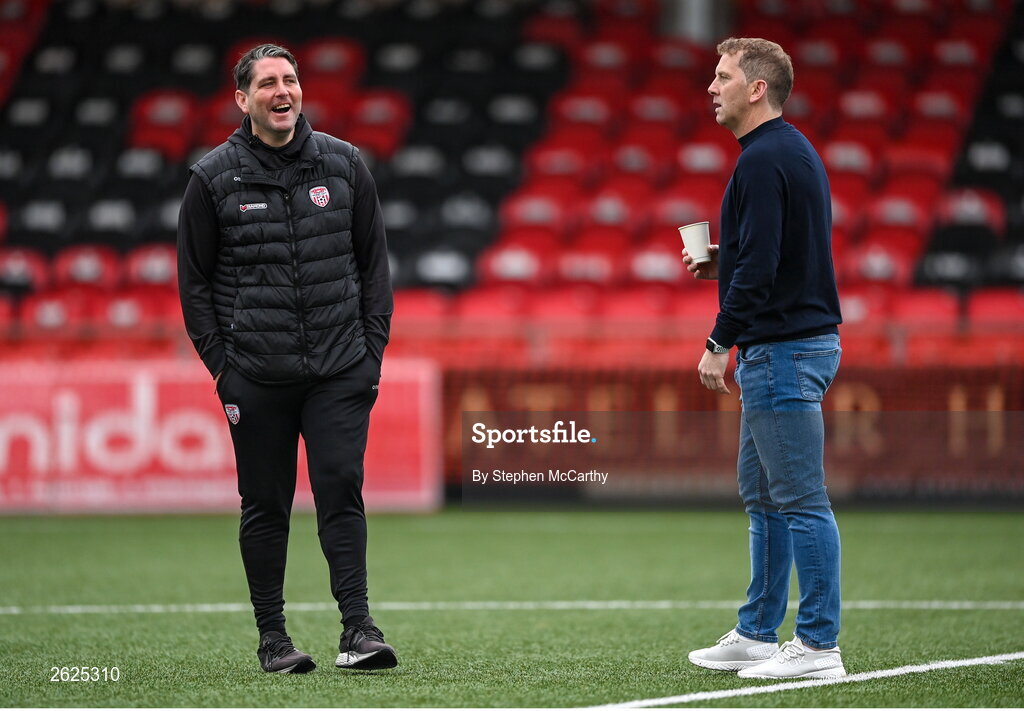 15 September 2023; Derry City manager Ruaidhrí Higgins, left, and former Dundalk manager Vinny Perth before the SSE Airtricity Men's Premier Division match between Derry City and Shamrock Rovers at The Ryan McBride Brandywell Stadium in Derry. Photo by Stephen McCarthy/Sportsfile