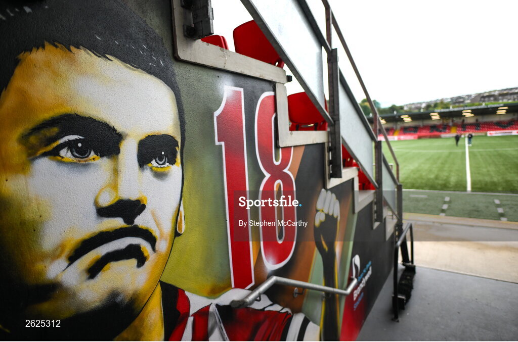 15 September 2023; A view of a mural dedicated to the late Derry City player Mark Farren before the SSE Airtricity Men's Premier Division match between Derry City and Shamrock Rovers at The Ryan McBride Brandywell Stadium in Derry. Photo by Stephen McCarthy/Sportsfile