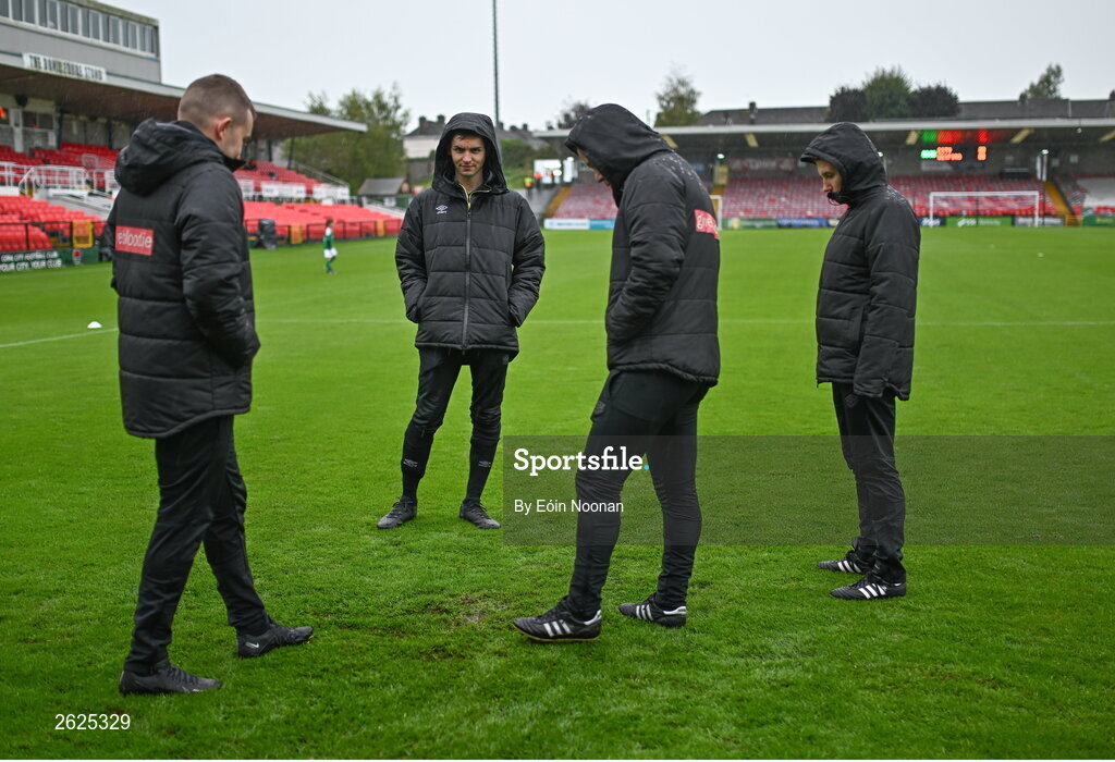 15 September 2023; The referees inspect the pitch before the Sports Direct Men’s FAI Cup quarter-final match between Cork City and Wexford at Turner's Cross in Cork. Photo by Eóin Noonan/Sportsfile