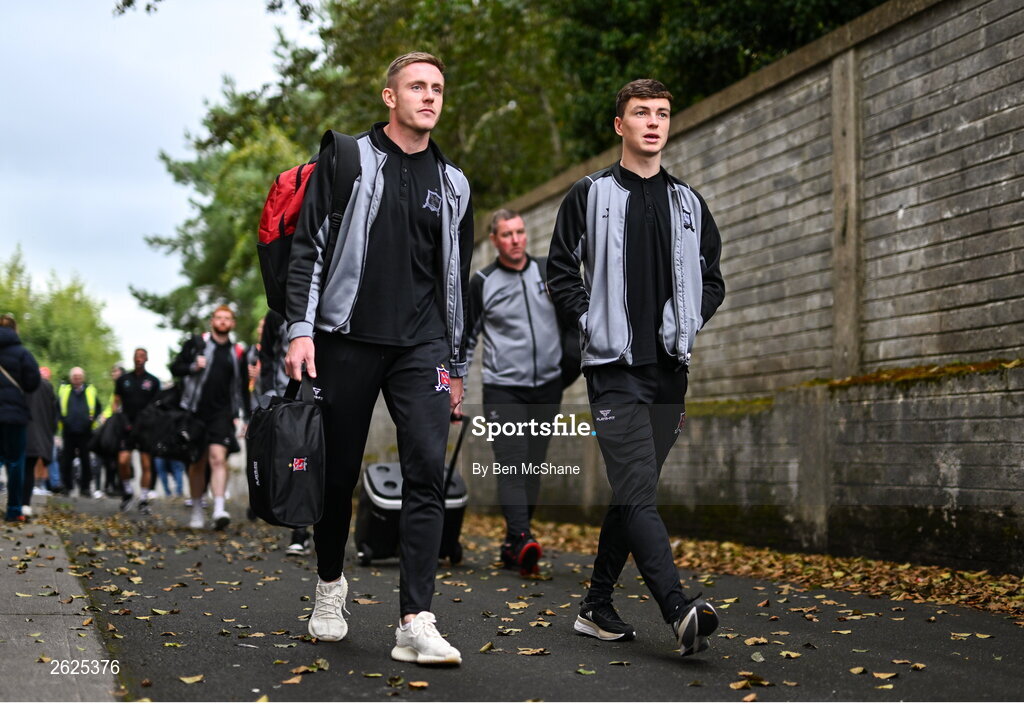 15 September 2023; Cameron Elliott, left, and Alfie Lewis of Dundalk arrive before the Sports Direct Men’s FAI Cup quarter-final match between Galway United and Dundalk at Eamonn Deacy Park in Galway. Photo by Ben McShane/Sportsfile