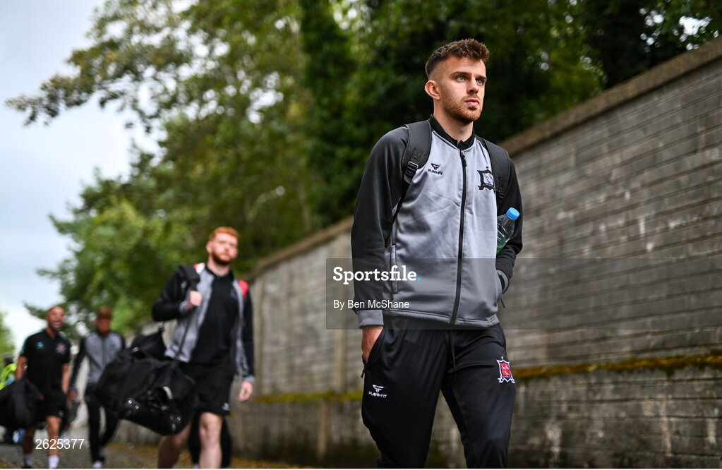 15 September 2023; Archie Davies of Dundalk arrives before the Sports Direct Men’s FAI Cup quarter-final match between Galway United and Dundalk at Eamonn Deacy Park in Galway. Photo by Ben McShane/Sportsfile