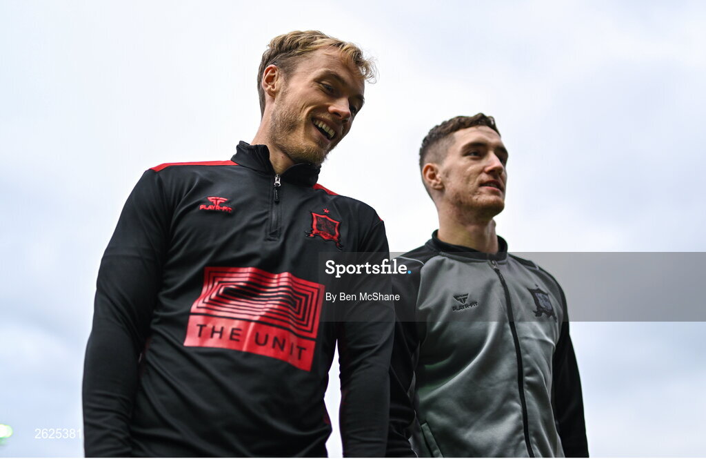 15 September 2023; Greg Sloggett, left, and John Martin of Dundalk before the Sports Direct Men’s FAI Cup quarter-final match between Galway United and Dundalk at Eamonn Deacy Park in Galway. Photo by Ben McShane/Sportsfile
