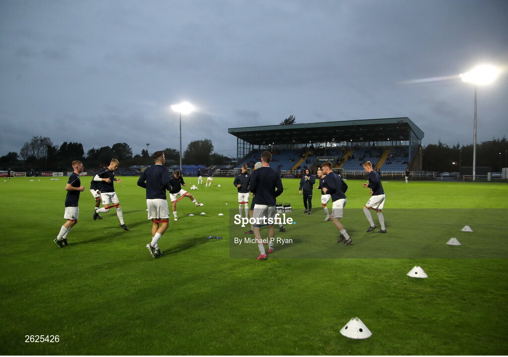 15 September 2023; Cobh Ramblers players warm up before the SSE Airtricity Men's First Division match between Waterford and Cobh Ramblers at RSC in Waterford. Photo by Michael P Ryan/Sportsfile