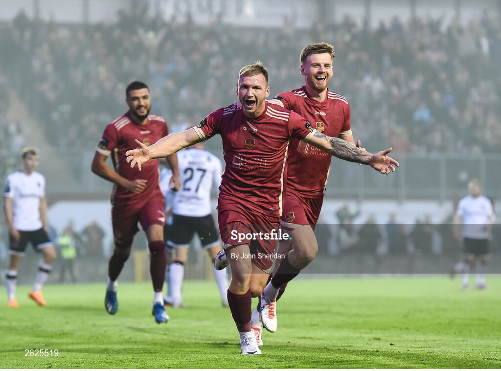 15 September 2023; Stephen Walsh of Galway United celebrates with team-mate Rob Slevin after scoring his side's first goal during the Sports Direct Men’s FAI Cup quarter-final match between Galway United and Dundalk at Eamonn Deacy Park in Galway. Photo by John Sheridan/Sportsfile