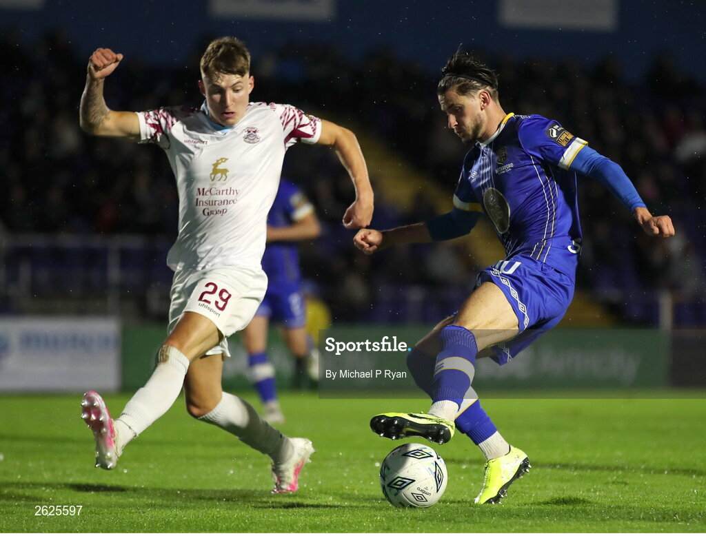 15 September 2023; Conor Parsons of Waterford in action against Tiernan O'Brien of Cobh Ramblers during the SSE Airtricity Men's First Division match between Waterford and Cobh Ramblers at RSC in Waterford. Photo by Michael P Ryan/Sportsfile