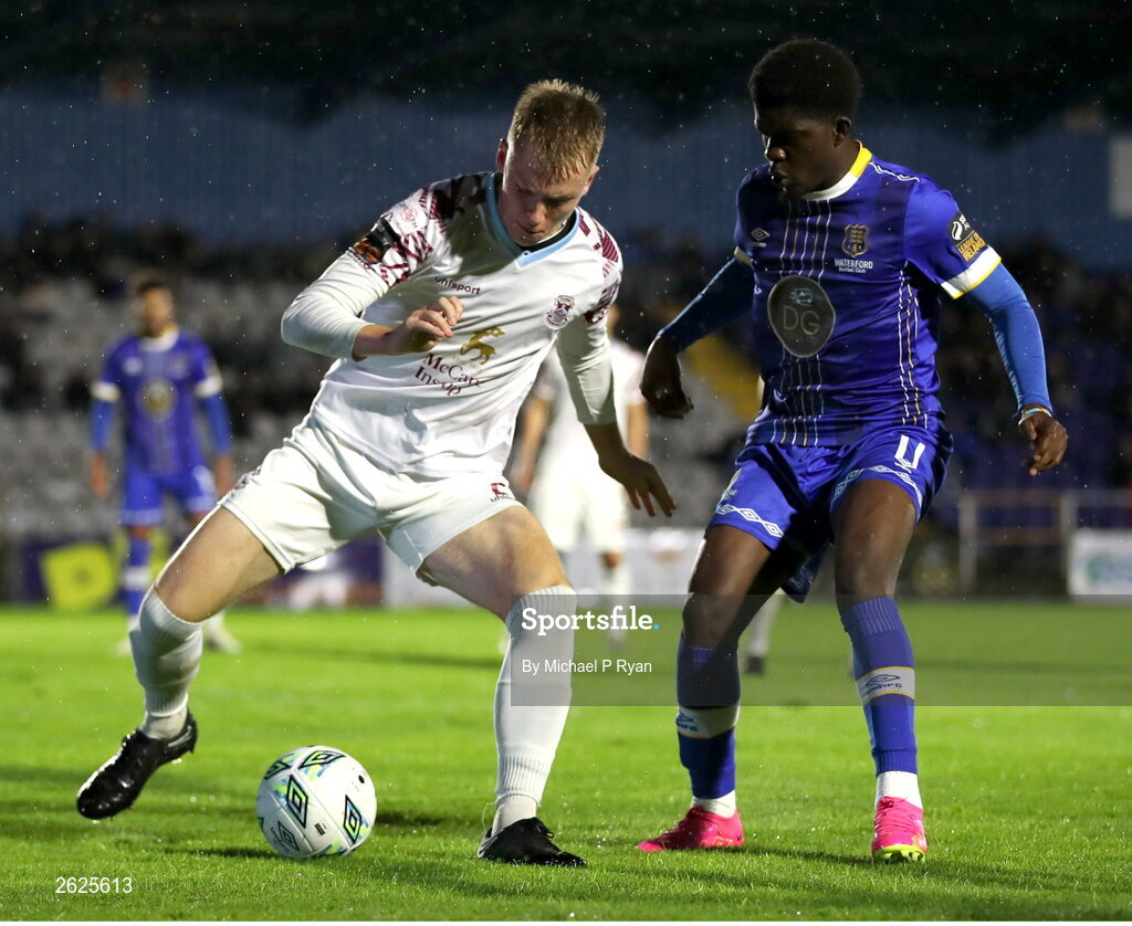 15 September 2023; Michael McCarthy of Cobh Ramblers in action against Serge Atakayi of Waterford during the SSE Airtricity Men's First Division match between Waterford and Cobh Ramblers at RSC in Waterford. Photo by Michael P Ryan/Sportsfile