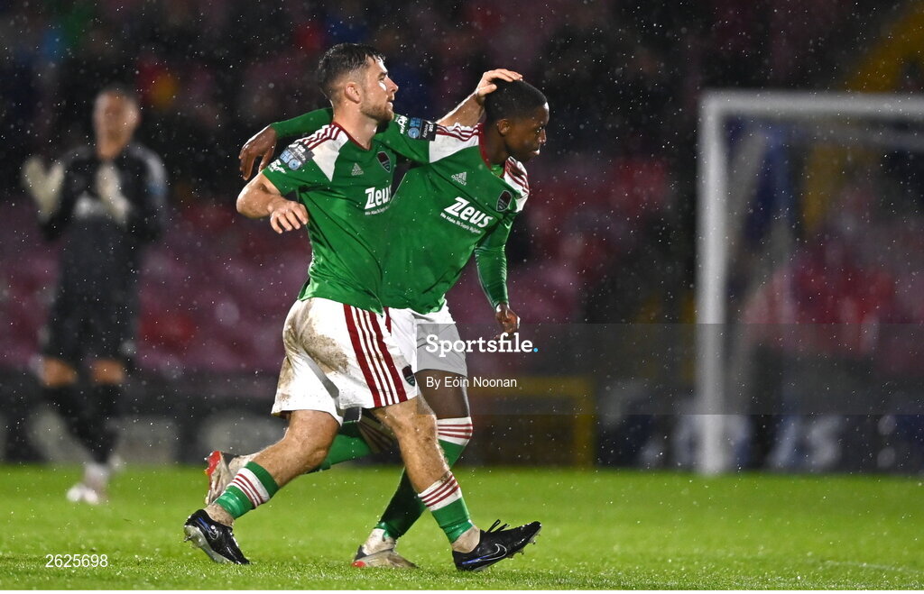 15 September 2023; Malik Dijksteel of Cork City, right, celebrates with team-mate Aaron Bolger after scoring their side's first goal during the Sports Direct Men’s FAI Cup quarter final match between Cork City and Wexford at Turner's Cross in Cork. Photo by Eóin Noonan/Sportsfile