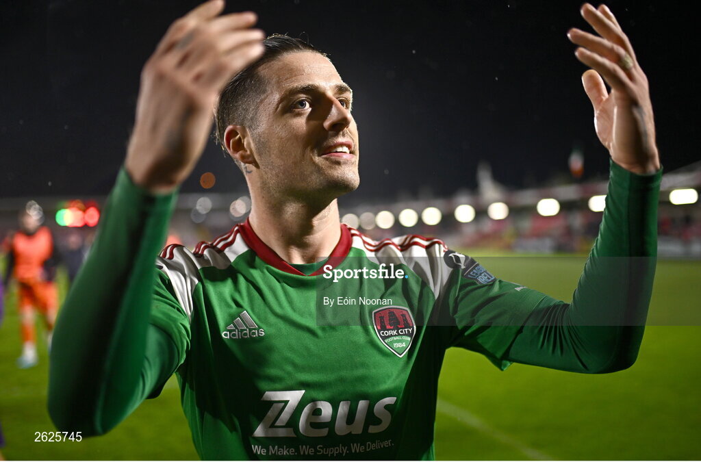 15 September 2023; Ruairi Keating of Cork City celebrates after his side's victory in the Sports Direct Men’s FAI Cup quarter final match between Cork City and Wexford at Turner's Cross in Cork. Photo by Eóin Noonan/Sportsfile