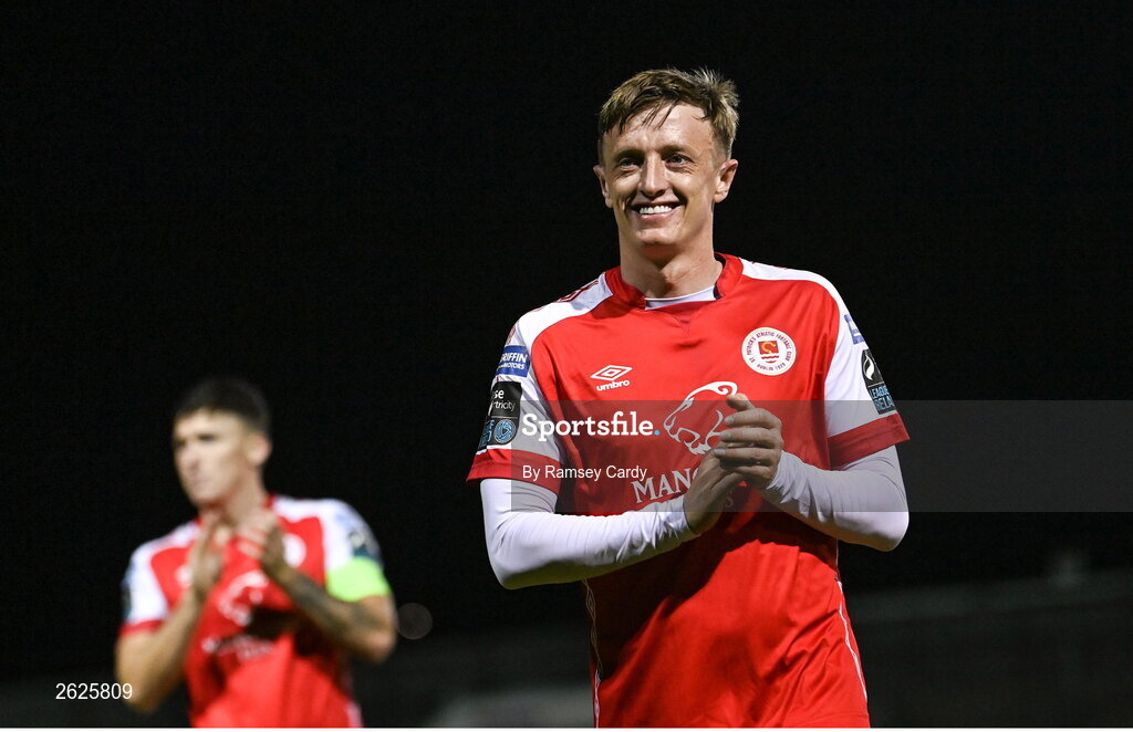 15 September 2023; Chris Forrester of St Patrick's Athletic celebrates after the Sports Direct Men’s FAI Cup quarter-final match between Finn Harps and St Patrick's Athletic at Finn Park in Ballybofey, Donegal. Photo by Ramsey Cardy/Sportsfile