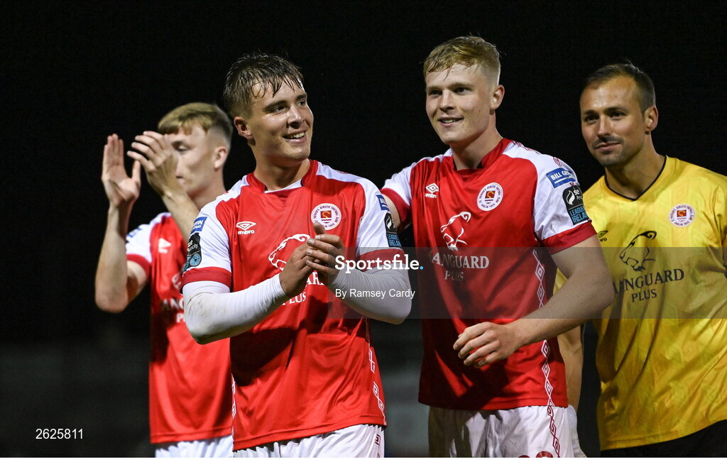 15 September 2023; Tommy Lonergan, left, and Jay McGrath of St Patrick's Athletic celebrate after the Sports Direct Men’s FAI Cup quarter-final match between Finn Harps and St Patrick's Athletic at Finn Park in Ballybofey, Donegal. Photo by Ramsey Cardy/Sportsfile