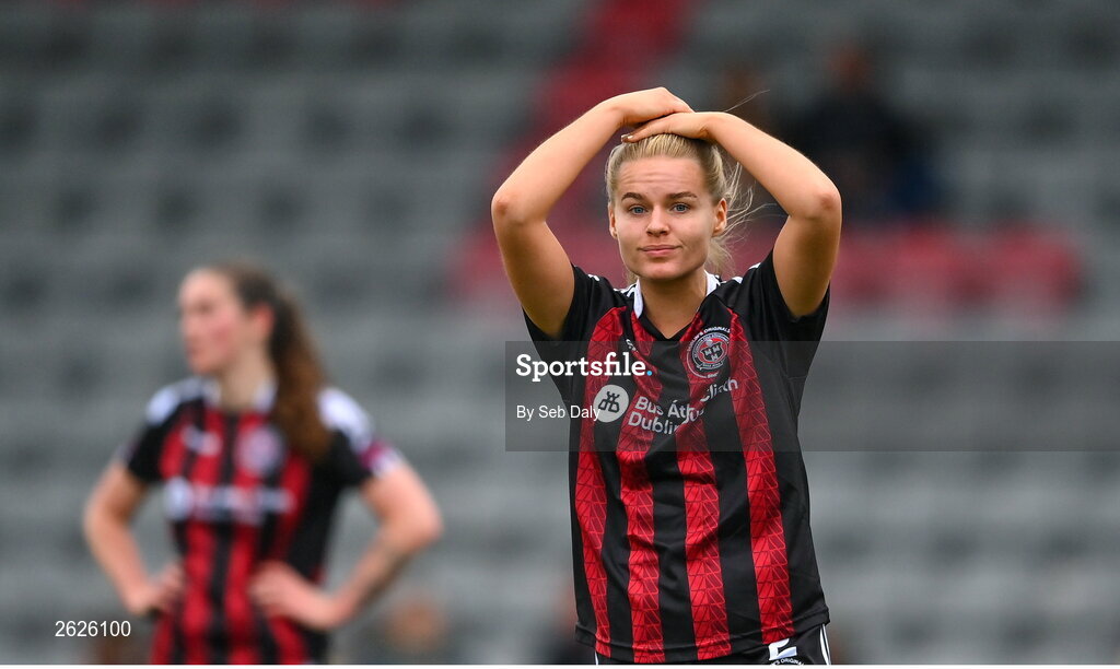 16 September 2023; Lynn Craven of Bohemians after her side's defeat in the Sports Direct Women's FAI Cup quarter-final match between Bohemians and Sligo Rovers at Dalymount Park in Dublin. Photo by Seb Daly/Sportsfile