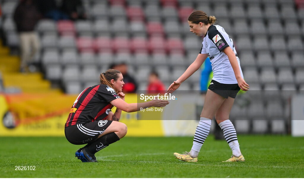 16 September 2023; Lisa Murphy of Bohemians and Sarah Kiernan of Sligo Rovers after the Sports Direct Women's FAI Cup quarter-final match between Bohemians and Sligo Rovers at Dalymount Park in Dublin. Photo by Seb Daly/Sportsfile
