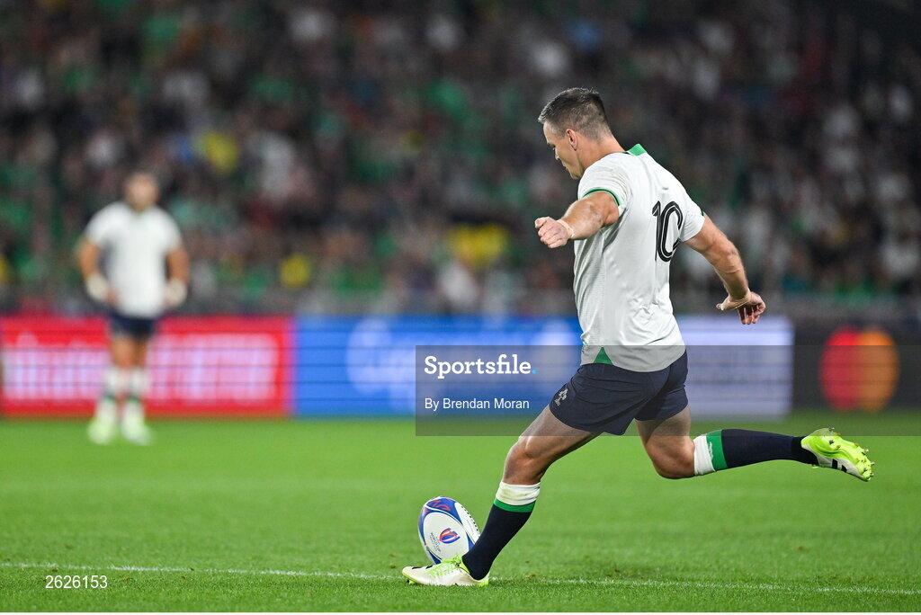 16 September 2023; Jonathan Sexton of Ireland kicks a penalty during the 2023 Rugby World Cup Pool B match between Ireland and Tonga at Stade de la Beaujoire in Nantes, France. Photo by Brendan Moran/Sportsfile