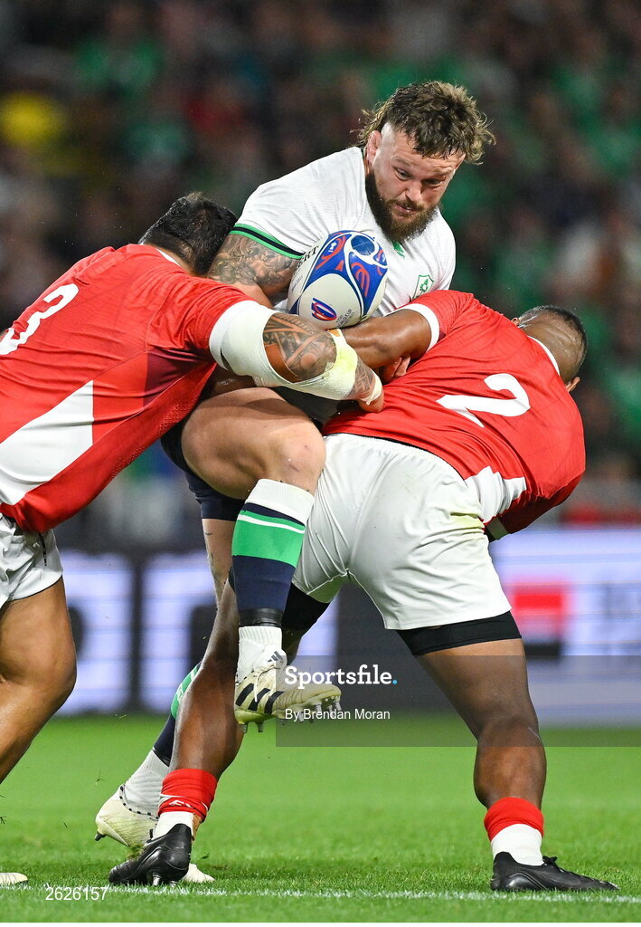 16 September 2023; Andrew Porter of Ireland is tackled by Ben Tameifuna, left, and Paula Ngauamo of Tonga during the 2023 Rugby World Cup Pool B match between Ireland and Tonga at Stade de la Beaujoire in Nantes, France. Photo by Brendan Moran/Sportsfile