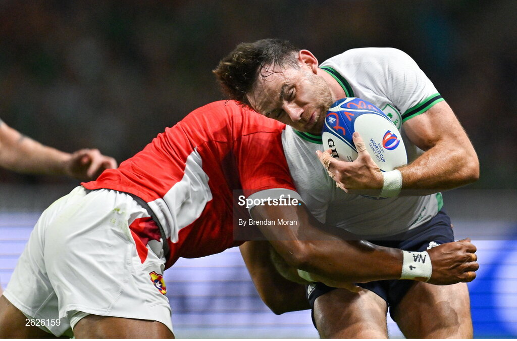 16 September 2023; Hugo Keenan of Ireland is tackled by Tanginoa Halaifonua of Tonga during the 2023 Rugby World Cup Pool B match between Ireland and Tonga at Stade de la Beaujoire in Nantes, France. Photo by Brendan Moran/Sportsfile