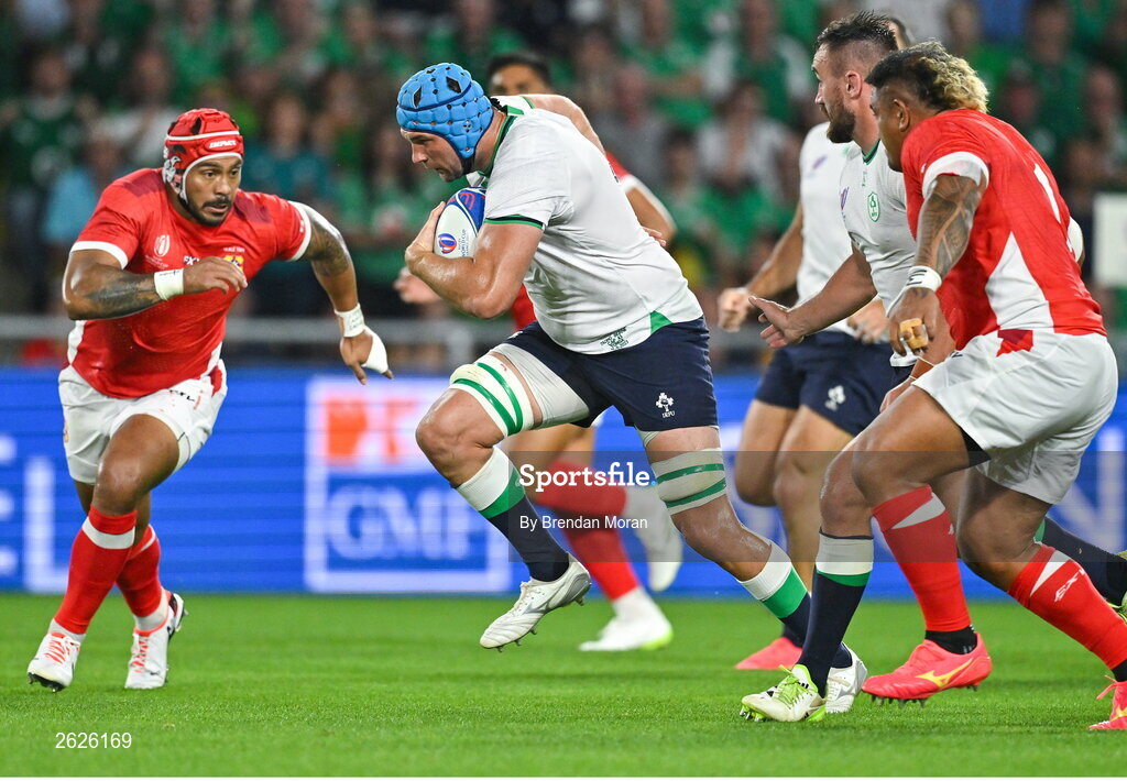 16 September 2023; Tadhg Beirne of Ireland on his way to scoring his side's first try during the 2023 Rugby World Cup Pool B match between Ireland and Tonga at Stade de la Beaujoire in Nantes, France. Photo by Brendan Moran/Sportsfile