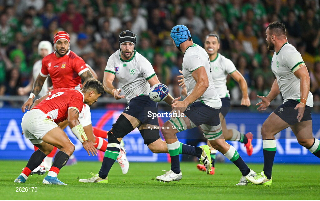 16 September 2023; Caelan Doris of Ireland offloads to teammate Tadhg Beirne in the build up to Tadhg Beirne scoring his side's first try during the 2023 Rugby World Cup Pool B match between Ireland and Tonga at Stade de la Beaujoire in Nantes, France. Photo by Brendan Moran/Sportsfile