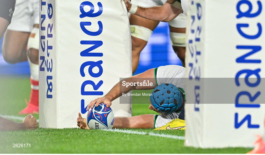 16 September 2023; Tadhg Beirne of Ireland dives to score his side's first try during the 2023 Rugby World Cup Pool B match between Ireland and Tonga at Stade de la Beaujoire in Nantes, France. Photo by Brendan Moran/Sportsfile