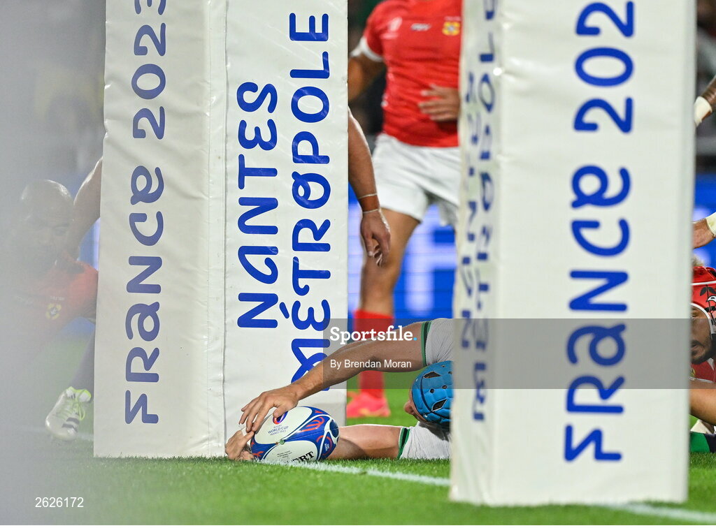 16 September 2023; Tadhg Beirne of Ireland dives to score his side's first try during the 2023 Rugby World Cup Pool B match between Ireland and Tonga at Stade de la Beaujoire in Nantes, France. Photo by Brendan Moran/Sportsfile