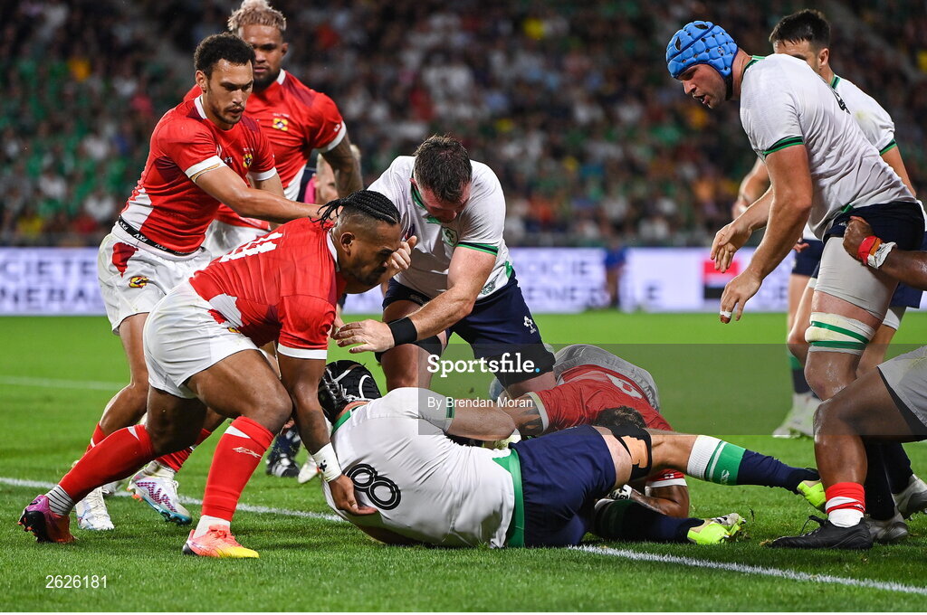 16 September 2023; Caelan Doris of Ireland on his way to scoring his side's second try during the 2023 Rugby World Cup Pool B match between Ireland and Tonga at Stade de la Beaujoire in Nantes, France. Photo by Brendan Moran/Sportsfile