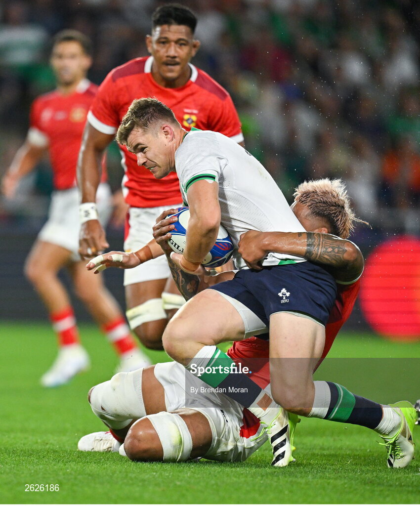 16 September 2023; Garry Ringrose of Ireland is tackled by Vaea Fifita of Tonga during the 2023 Rugby World Cup Pool B match between Ireland and Tonga at Stade de la Beaujoire in Nantes, France. Photo by Brendan Moran/Sportsfile