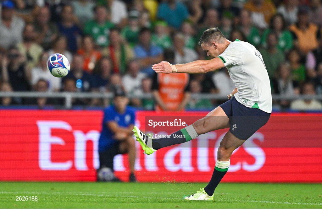16 September 2023; Jonathan Sexton of Ireland kicks a conversion to equal his country's all-time record points scorer in international rugby during the 2023 Rugby World Cup Pool B match between Ireland and Tonga at Stade de la Beaujoire in Nantes, France. Photo by Brendan Moran/Sportsfile