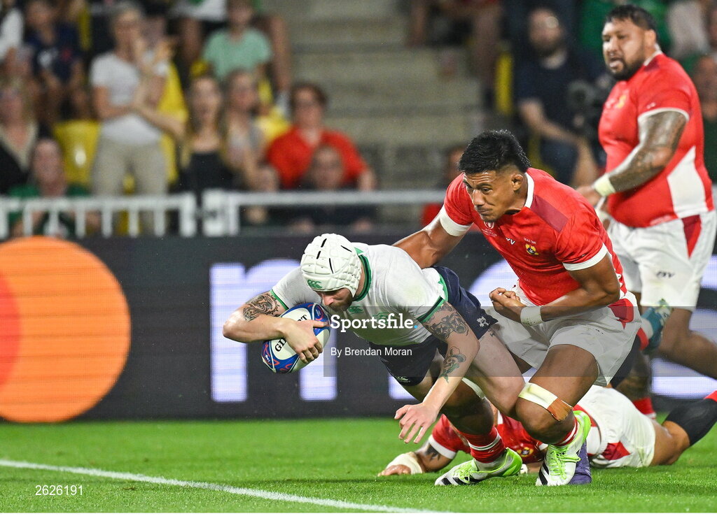 16 September 2023; Mack Hansen of Ireland dives to score his side's third try during the 2023 Rugby World Cup Pool B match between Ireland and Tonga at Stade de la Beaujoire in Nantes, France. Photo by Brendan Moran/Sportsfile