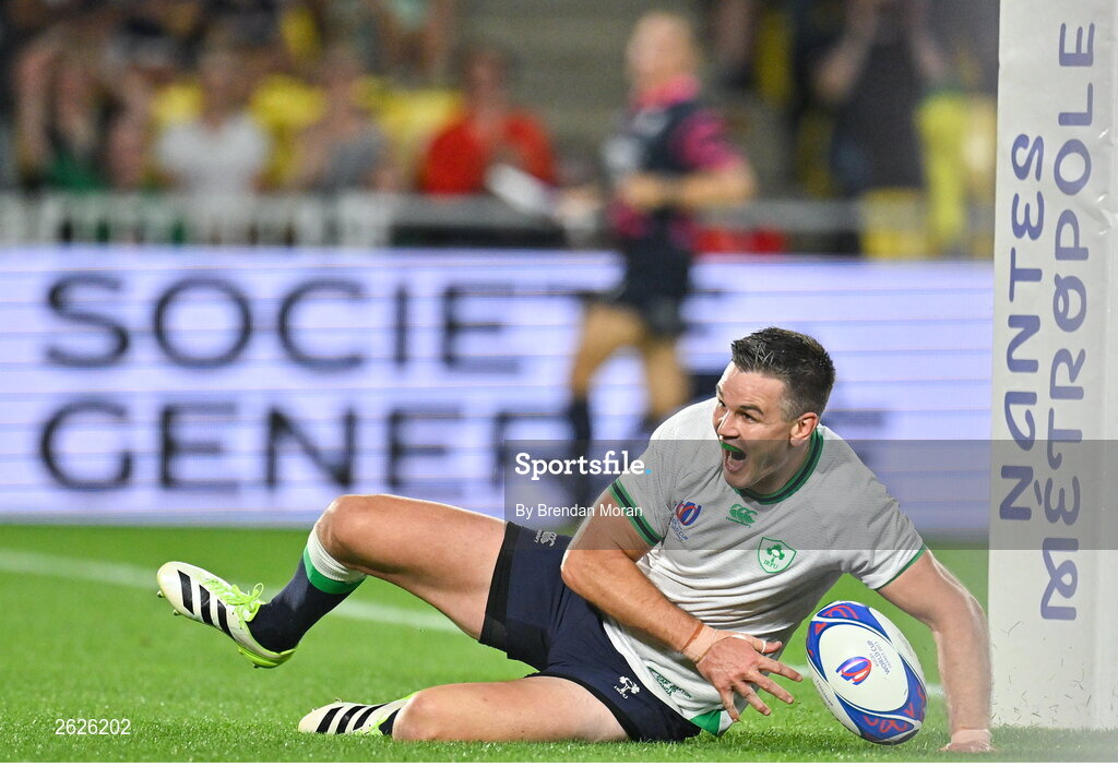 16 September 2023; Jonathan Sexton of Ireland celebrates scoring his side's fourth try to become his country's all-time top points scorer in international rugby during the 2023 Rugby World Cup Pool B match between Ireland and Tonga at Stade de la Beaujoire in Nantes, France. Photo by Brendan Moran/Sportsfile
