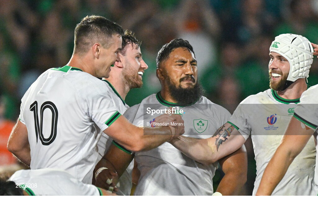 16 September 2023; Jonathan Sexton of Ireland, left, celebrates with teammates ìncluding Mack Hansen after scoring his side's fourth try to become his country's all-time record points scorer in international rugby during the 2023 Rugby World Cup Pool B match between Ireland and Tonga at Stade de la Beaujoire in Nantes, France. Photo by Brendan Moran/Sportsfile
