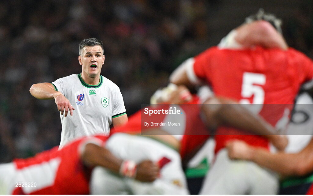 16 September 2023; Jonathan Sexton of Ireland directs a maul during the 2023 Rugby World Cup Pool B match between Ireland and Tonga at Stade de la Beaujoire in Nantes, France. Photo by Brendan Moran/Sportsfile