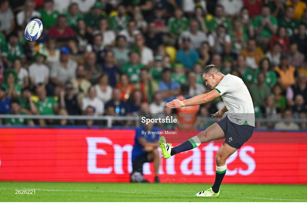 16 September 2023; Jonathan Sexton of Ireland kicks a conversion to equal his country's all-time record points scorer in international rugby during the 2023 Rugby World Cup Pool B match between Ireland and Tonga at Stade de la Beaujoire in Nantes, France. Photo by Brendan Moran/Sportsfile