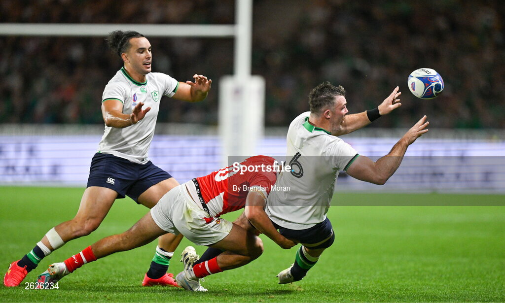 16 September 2023; Peter O’Mahony of Ireland offloads despite the tackle of William Havili of Tonga during the 2023 Rugby World Cup Pool B match between Ireland and Tonga at Stade de la Beaujoire in Nantes, France. Photo by Brendan Moran/Sportsfile
