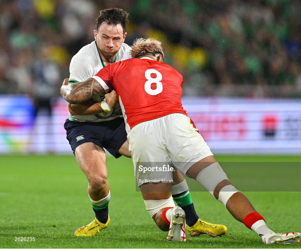 16 September 2023; Hugo Keenan of Ireland is tackled by Vaea Fifita of Tonga during the 2023 Rugby World Cup Pool B match between Ireland and Tonga at Stade de la Beaujoire in Nantes, France. Photo by Brendan Moran/Sportsfile