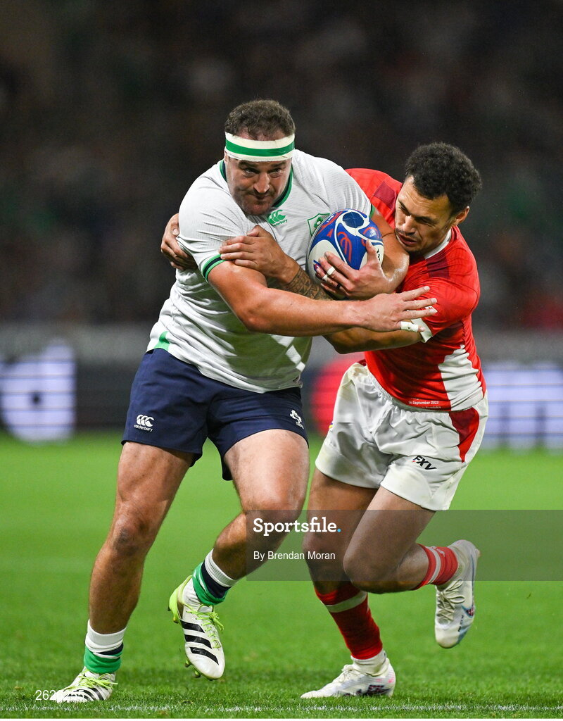 16 September 2023; Rob Herring of Ireland is tackled by William Havili of Tonga during the 2023 Rugby World Cup Pool B match between Ireland and Tonga at Stade de la Beaujoire in Nantes, France. Photo by Brendan Moran/Sportsfile
