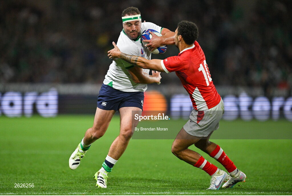 16 September 2023; Rob Herring of Ireland is tackled by William Havili of Tonga during the 2023 Rugby World Cup Pool B match between Ireland and Tonga at Stade de la Beaujoire in Nantes, France. Photo by Brendan Moran/Sportsfile
