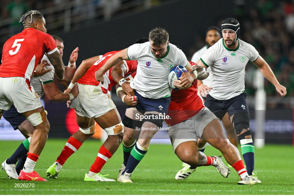 16 September 2023; Peter O’Mahony of Ireland is tackled by Tanginoa Halaifonua, left, and Ben Tameifuna of Tonga during the 2023 Rugby World Cup Pool B match between Ireland and Tonga at Stade de la Beaujoire in Nantes, France. Photo by Brendan Moran/Sportsfile