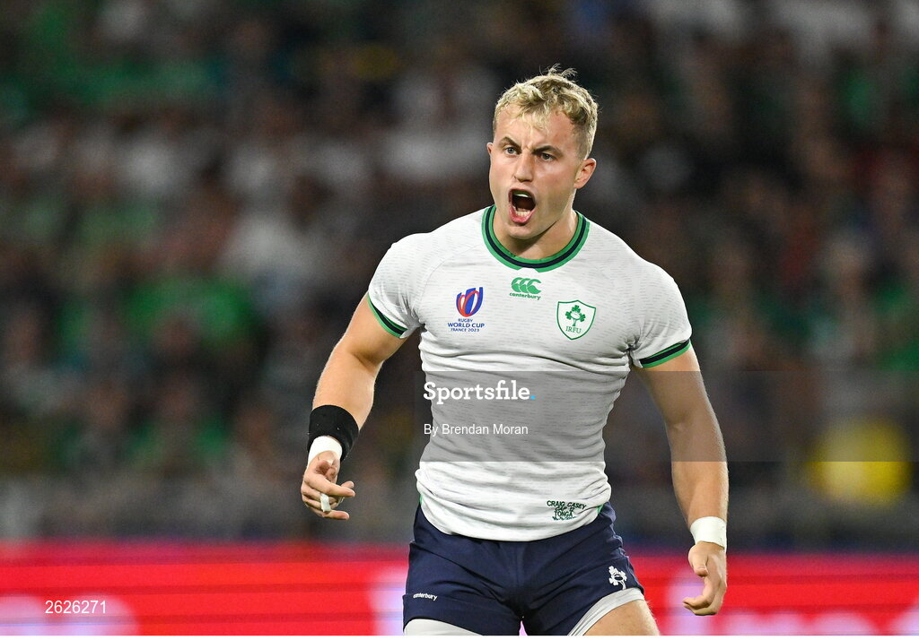 16 September 2023; Craig Casey of Ireland during the 2023 Rugby World Cup Pool B match between Ireland and Tonga at Stade de la Beaujoire in Nantes, France. Photo by Brendan Moran/Sportsfile