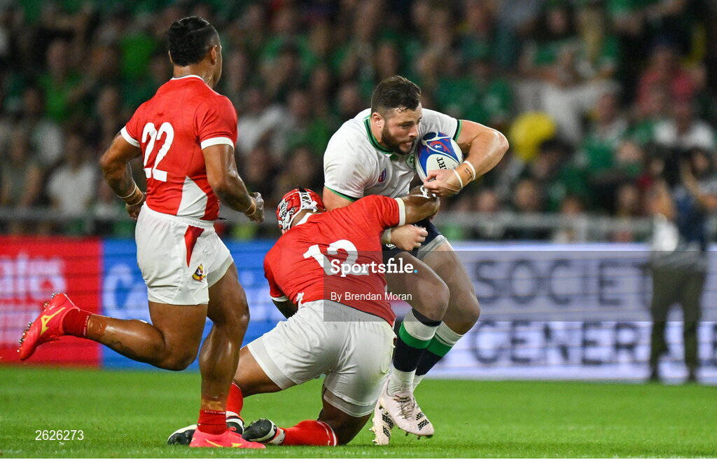 16 September 2023; Robbie Henshaw of Ireland is tackled by Pita Ahki of Tonga during the 2023 Rugby World Cup Pool B match between Ireland and Tonga at Stade de la Beaujoire in Nantes, France. Photo by Brendan Moran/Sportsfile
