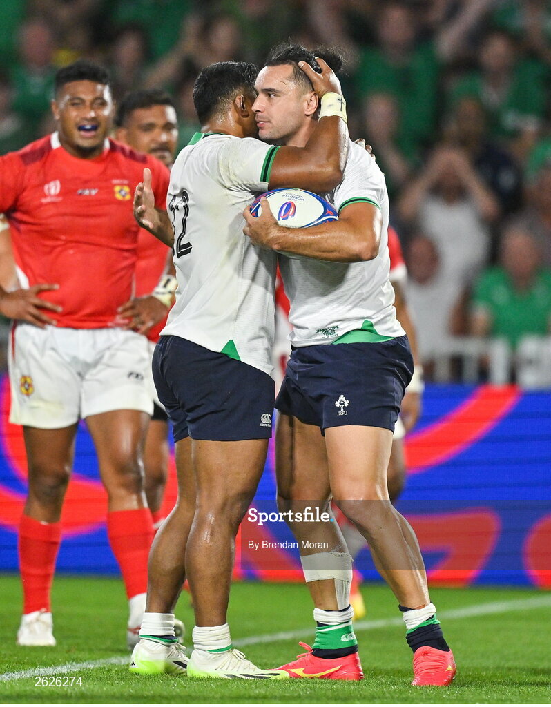 16 September 2023; James Lowe of Ireland celebrates with teammate Bundee Aki after scoring his side's fifth try during the 2023 Rugby World Cup Pool B match between Ireland and Tonga at Stade de la Beaujoire in Nantes, France. Photo by Brendan Moran/Sportsfile