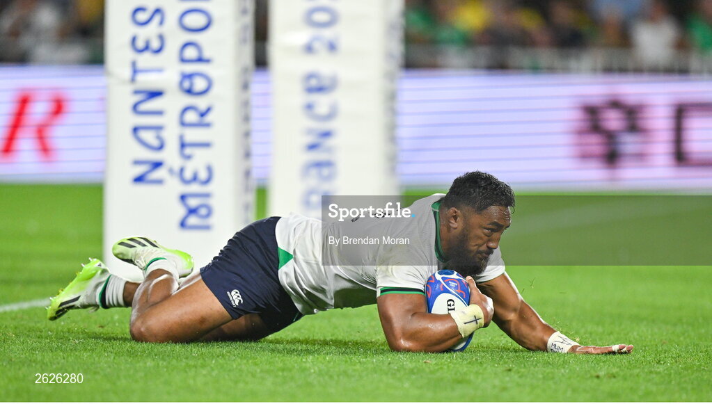 16 September 2023; Bundee Aki of Ireland dives over to score his side's sixth try during the 2023 Rugby World Cup Pool B match between Ireland and Tonga at Stade de la Beaujoire in Nantes, France. Photo by Brendan Moran/Sportsfile
