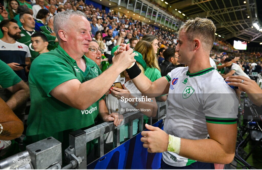 16 September 2023; Craig Casey of Ireland with his father Ger after his side's victory in the 2023 Rugby World Cup Pool B match between Ireland and Tonga at Stade de la Beaujoire in Nantes, France. Photo by Brendan Moran/Sportsfile
