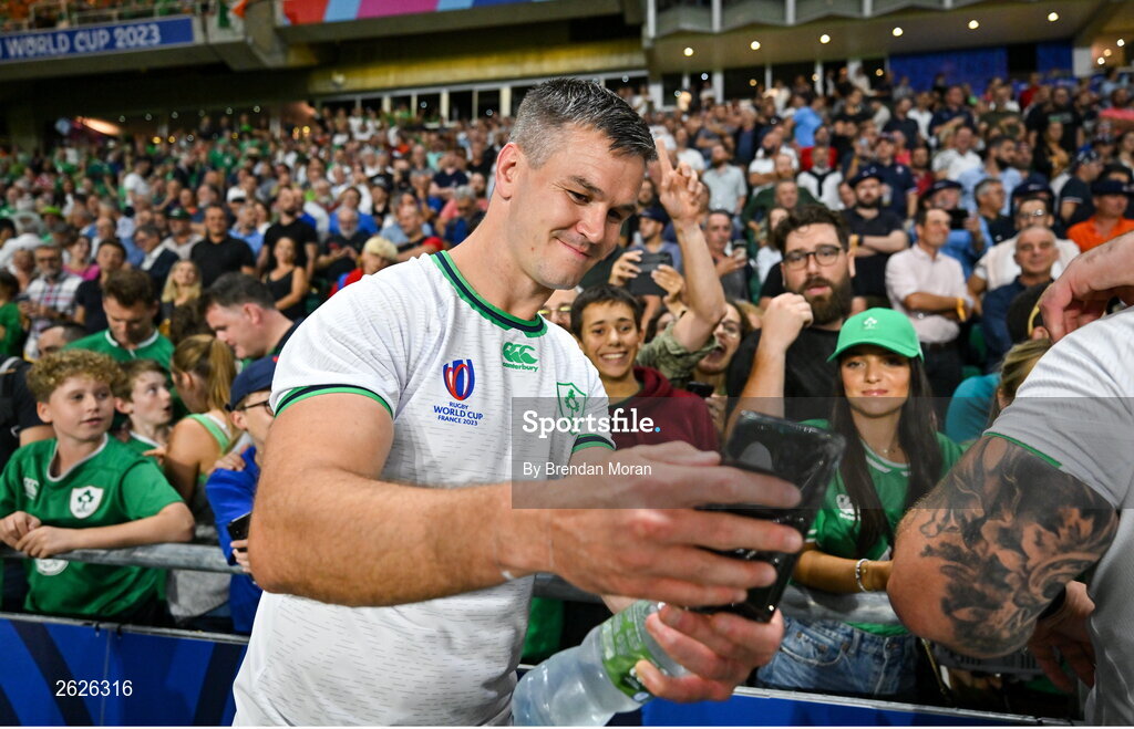 16 September 2023; Jonathan Sexton of Ireland takes selfies with supporters after his side's victory in the 2023 Rugby World Cup Pool B match between Ireland and Tonga at Stade de la Beaujoire in Nantes, France. Photo by Brendan Moran/Sportsfile