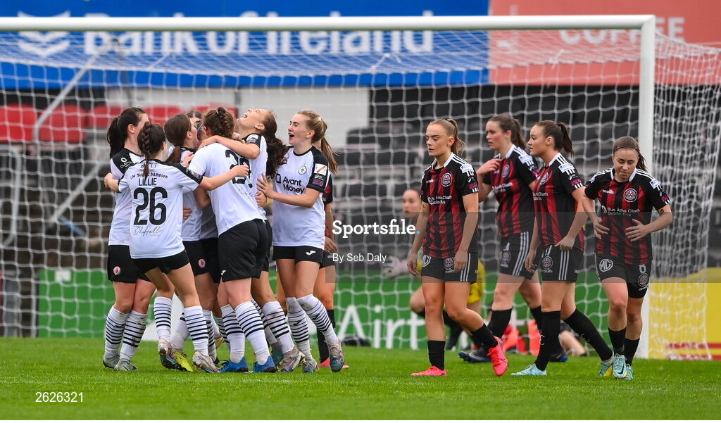16 September 2023; Sligo Rovers players, left, celebrate their side's goal, scored by Emma Hansberry, hidden, during the Sports Direct Women's FAI Cup quarter-final match between Bohemians and Sligo Rovers at Dalymount Park in Dublin. Photo by Seb Daly/Sportsfile