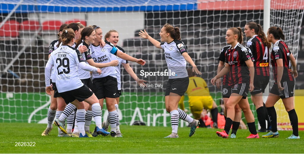 16 September 2023; Emma Hansberry of Sligo Rovers, centre, celebrates with teammates after scoring their side's first goal during the Sports Direct Women's FAI Cup quarter-final match between Bohemians and Sligo Rovers at Dalymount Park in Dublin. Photo by Seb Daly/Sportsfile