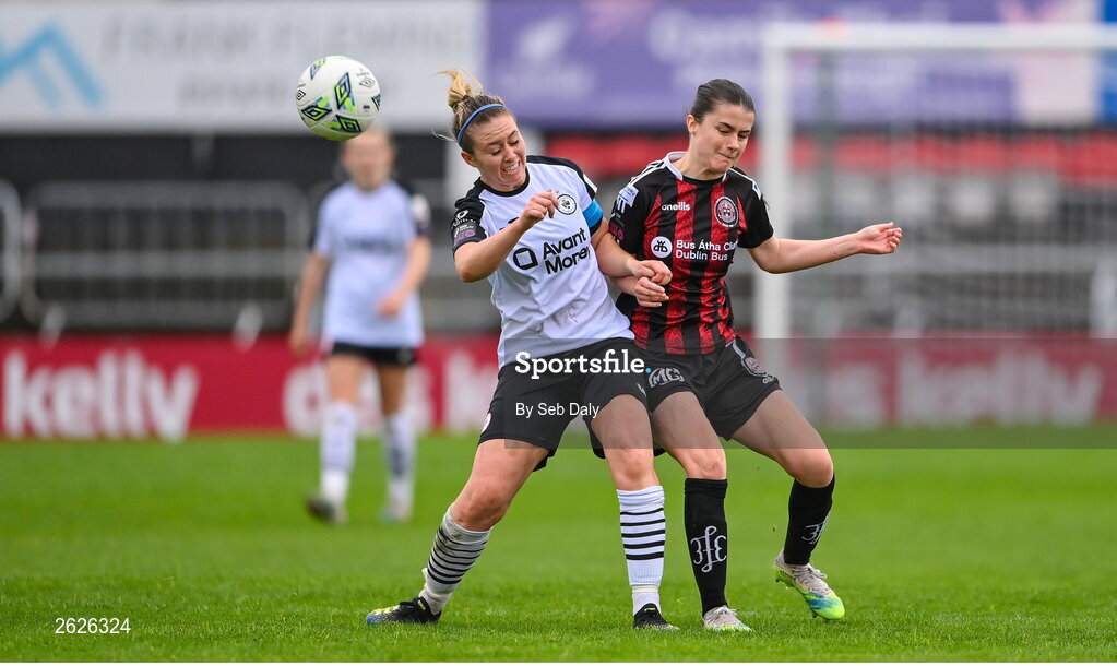 16 September 2023; Emma Hansberry of Sligo Rovers in action against Kira Bates Crosbie of Bohemians during the Sports Direct Women's FAI Cup quarter-final match between Bohemians and Sligo Rovers at Dalymount Park in Dublin. Photo by Seb Daly/Sportsfile