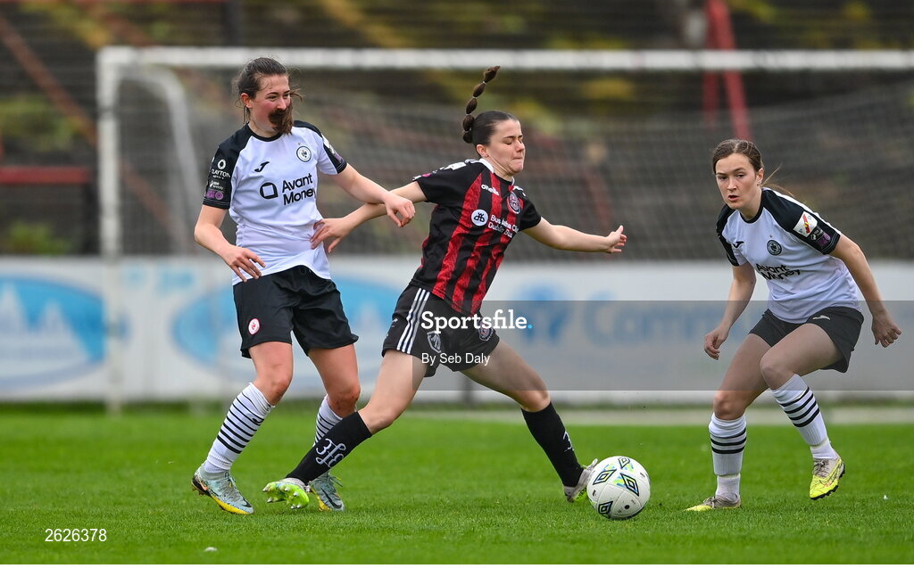 16 September 2023; Kira Bates Crosbie of Bohemians in action against Lauren Boles of Sligo Rovers, left, during the Sports Direct Women's FAI Cup quarter-final match between Bohemians and Sligo Rovers at Dalymount Park in Dublin. Photo by Seb Daly/Sportsfile