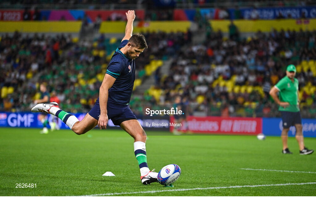 16 September 2023; Ross Byrne of Ireland during the warm up before the 2023 Rugby World Cup Pool B match between Ireland and Tonga at Stade de la Beaujoire in Nantes, France. Photo by Brendan Moran/Sportsfile
