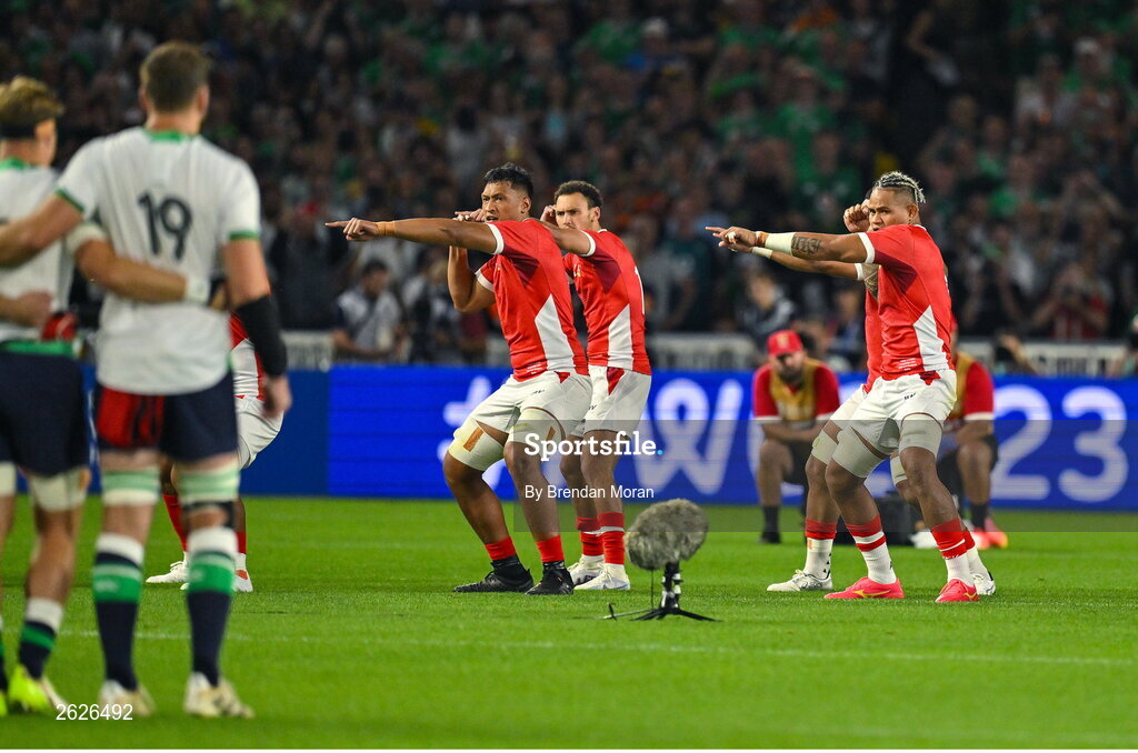 16 September 2023; Tonga players perform the Sipi Tau before the 2023 Rugby World Cup Pool B match between Ireland and Tonga at Stade de la Beaujoire in Nantes, France. Photo by Brendan Moran/Sportsfile