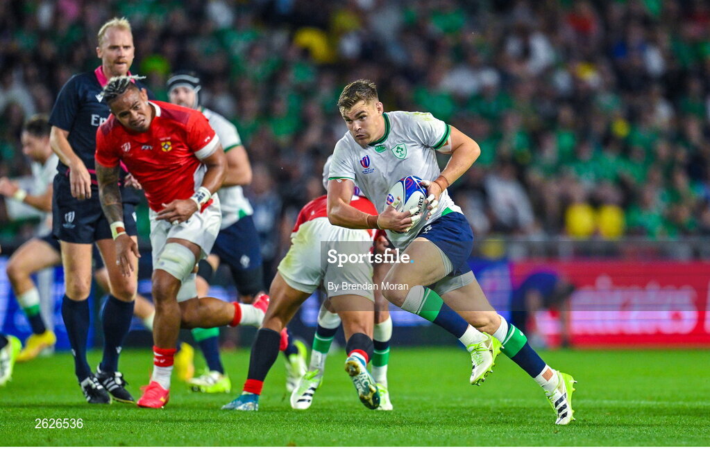 16 September 2023; Garry Ringrose of Ireland makes a break during the 2023 Rugby World Cup Pool B match between Ireland and Tonga at Stade de la Beaujoire in Nantes, France. Photo by Brendan Moran/Sportsfile